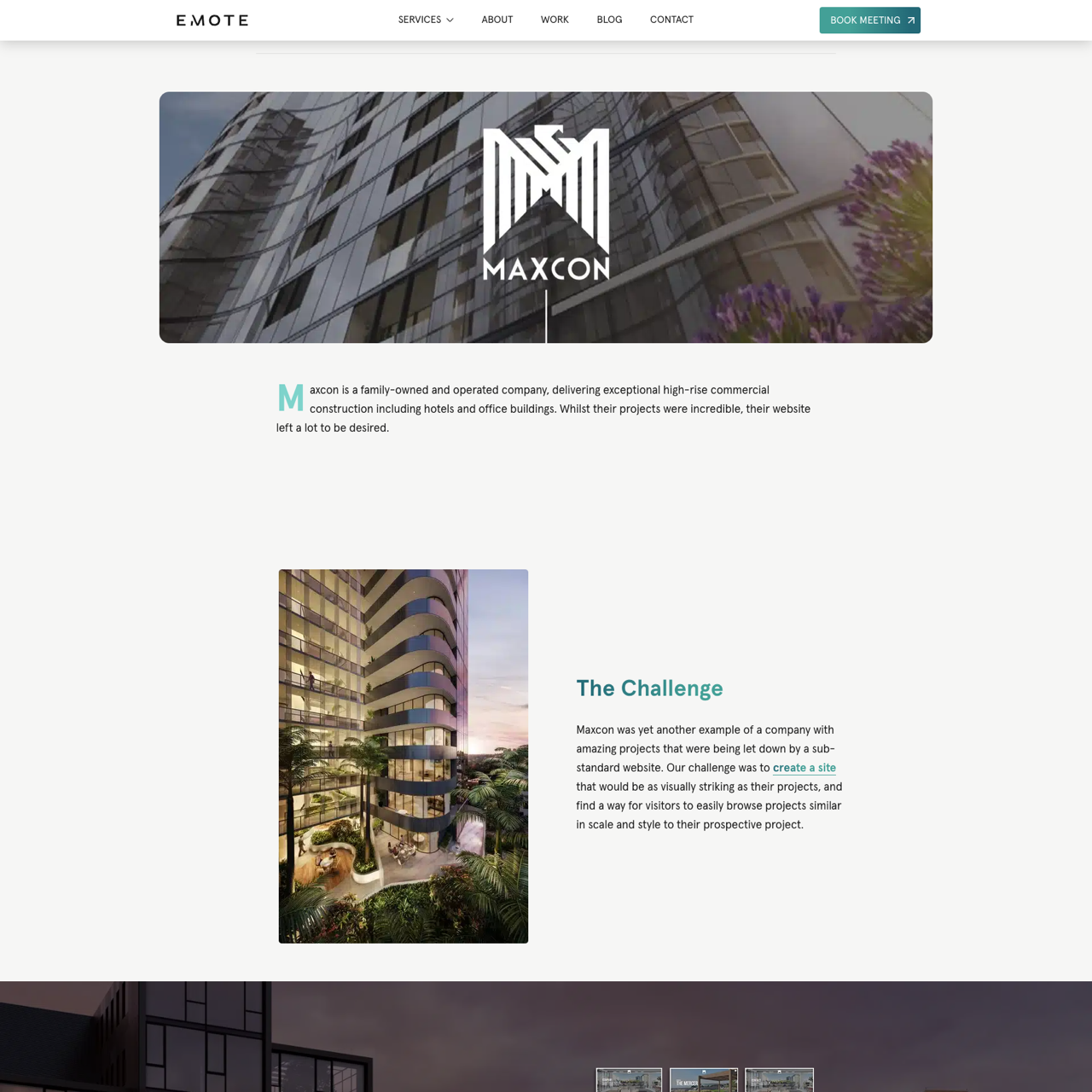Maxcon's parallax-scrolling website redesign elevates their premium construction brand, showcasing high-rise commercial projects with immersive visual storytelling. The site features a sleek, user-centric design that highlights their meticulous standards and expansive portfolio of hotels and office buildings. Through strategic wireframing and visual search tools, the platform enables effortless navigation of case studies, transforming the online experience into a compelling journey through Maxcon's architectural excellence. The result is a visually striking, mobile-friendly site that not only meets but exceeds client expectations, reinforcing Maxcon's reputation as a leader in innovative construction solutions.