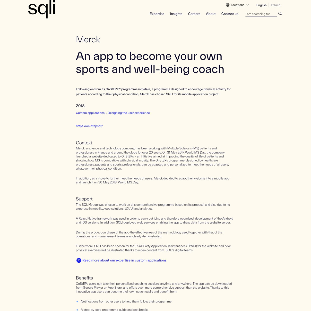 Merck's OnStEPs app, launched in 2018, offers personalized coaching for MS patients, adapting the company's established OnStEPs program. The app, developed using React Native, enables users to access tailored physical activity plans and health insights. SQLI provided expertise in mobile development, web services, and analytics to ensure seamless integration of the app's features. The platform supports cross-platform functionality and includes video content from SQLI's digital teams to enhance user engagement. Merck's initiative aims to improve quality of life for individuals with MS by promoting physical activity and health management through a personalized, accessible digital solution.