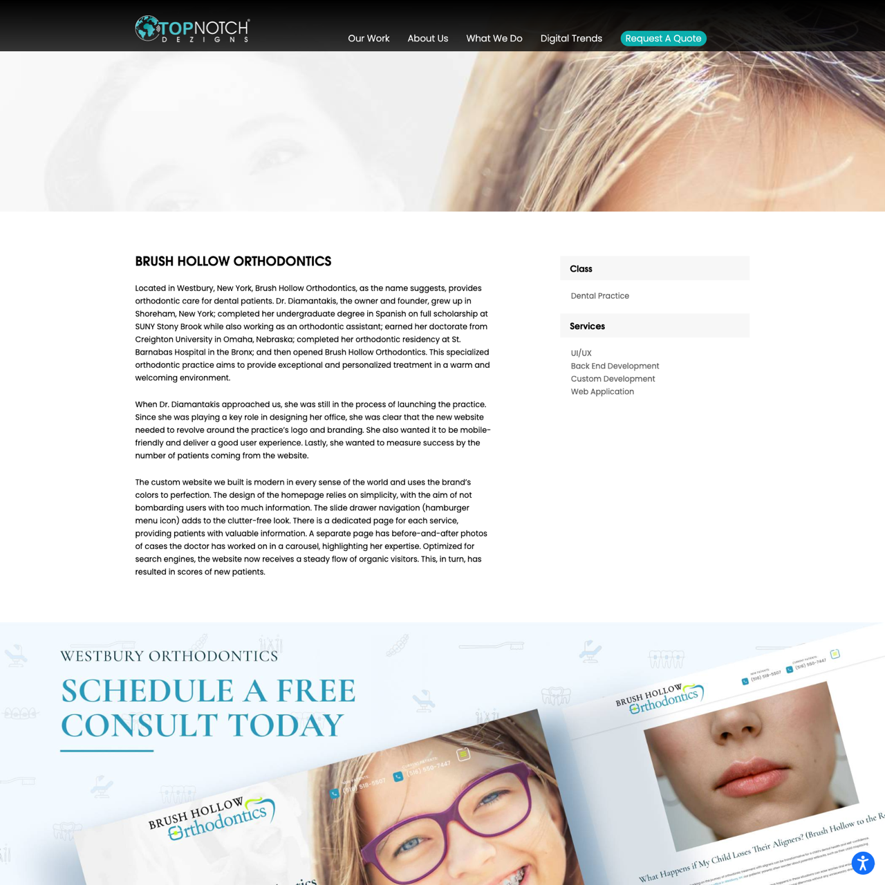 Brush Hollow Orthodontics launched a modern, mobile-friendly website to enhance patient engagement and drive traffic. Designed with the brand’s colors and simplicity in mind, the site features a streamlined layout, a slide drawer navigation, and dedicated pages for each service. Before-and-after photo carousel highlights the practice’s expertise, while optimized for search engines ensures steady organic traffic. The website’s success is reflected in a surge in new patients, demonstrating its effectiveness in boosting visibility and patient acquisition.
