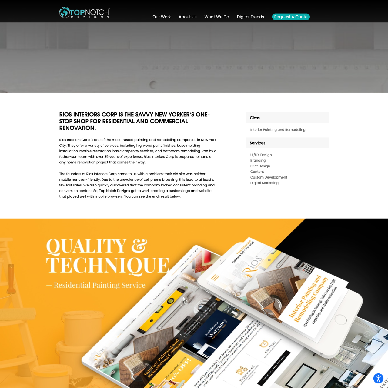 Rios Interiors Corp faced challenges with a non-mobile-friendly site, leading to lost sales and inconsistent branding. Top Notch Dezigns redesigned their platform to enhance user experience, introducing a custom logo and mobile-optimized design. The new site boosted digital visibility and attracted potential clients, establishing a strong online presence. The platform now effectively showcases the brand's services and capabilities, driving engagement and conversions.