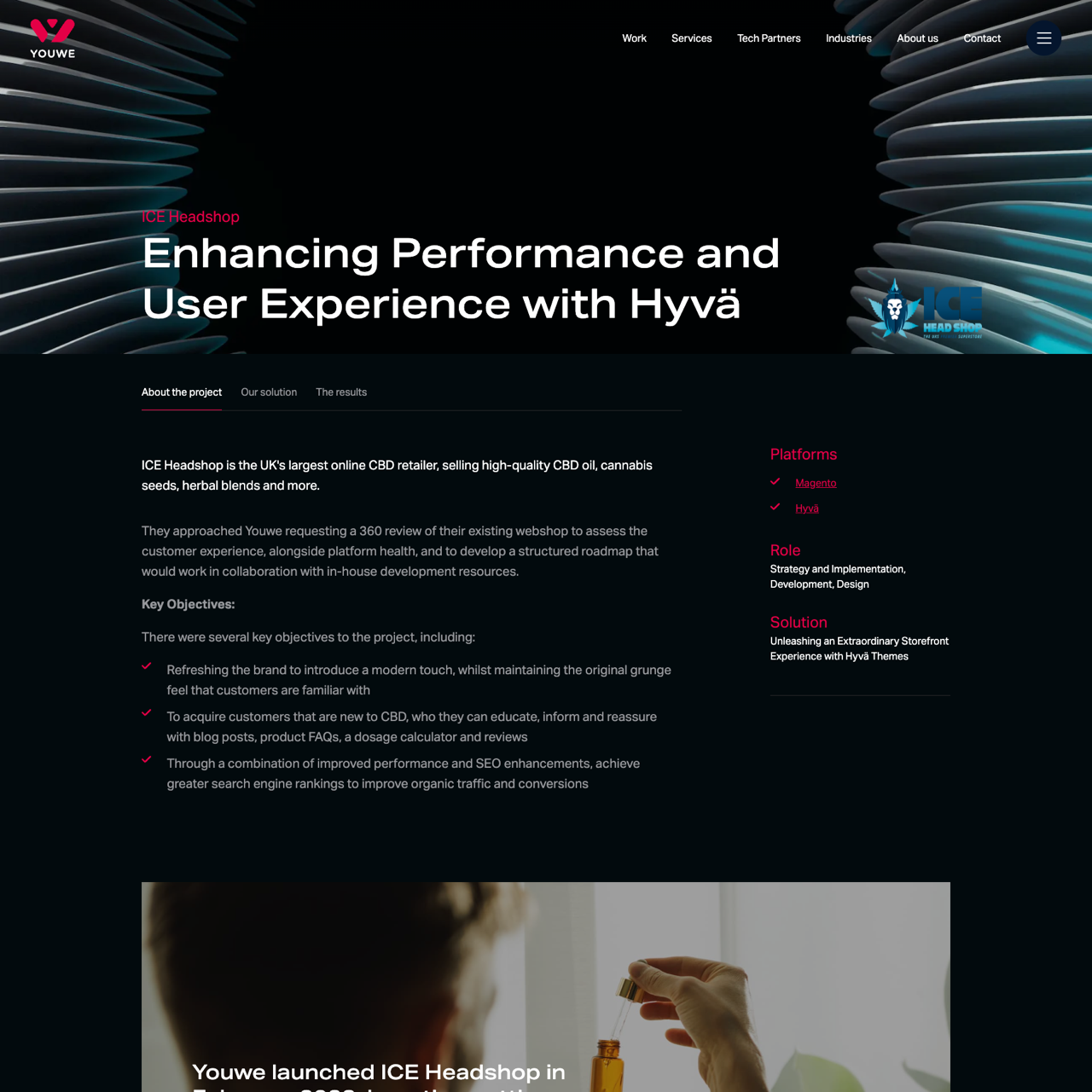 ICE Headshop, the UK's largest CBD retailer, partnered with Youwe to revamp their website using the Hyvä platform. The goal was to refresh the brand's aesthetic while maintaining its core identity, and to boost SEO performance for better organic traffic. Youwe recommended a complete rebuild, eliminating technical issues and ensuring a modern, scalable frontend. The result was a clean, responsive design that improved user experience and search engine rankings, laying a solid foundation for future growth. The new platform also enabled enhanced functionality, including a dosage calculator and improved product navigation, to attract new CBD-conscious customers.