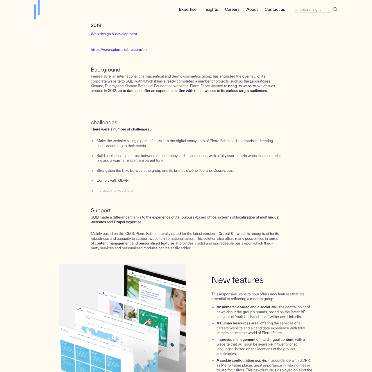 Pierre Fabre entrusted SQLI with revamping its corporate website to align with its brand identity and target audiences. The project aimed to enhance employer branding, user engagement, and digital presence across France and overseas. SQLI leveraged Drupal 8's robust capabilities to create a multilingual platform, ensuring seamless navigation for global users while maintaining a trustworthy, transparent experience. Key features included personalized content, improved user pathways, and compliance with GDPR regulations. The result was a modern, cohesive website that strengthened brand loyalty and drove market growth. The overhaul also reinforced connections between Pierre Fabre's core brands (Avène, Klorane, Ducray) and their respective audiences through a unified digital experience.