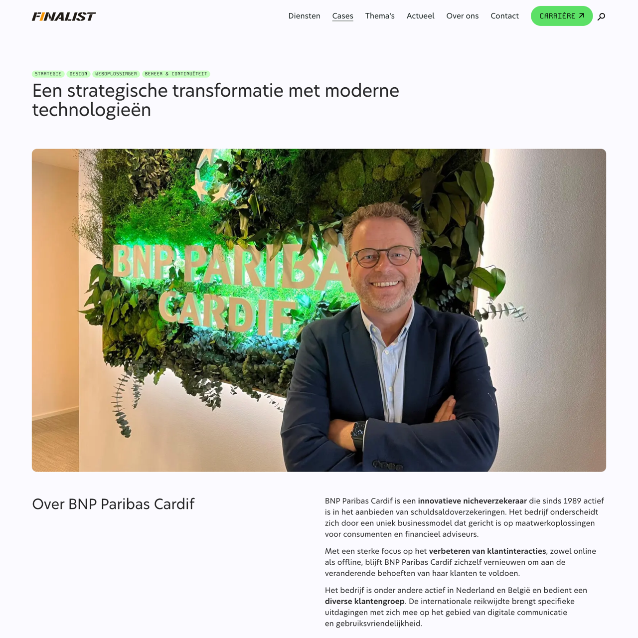 BNP Paribas Cardif partnered with Finalist to reimagine their digital experience, leveraging the Liferay platform to enhance customer engagement and operational efficiency. The project focused on developing innovative tools like the Premium Simulation Module, Advisor Search, and Document Management, which improved user insights and streamlined processes. The result was a more intuitive, personalized platform that boosted customer satisfaction and internal productivity. The collaboration demonstrated how modern technology can drive meaningful transformation in financial services.