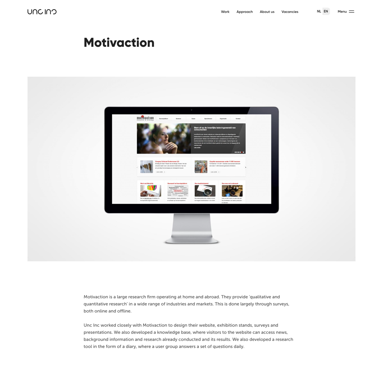UNC Inc collaborated with Motivaction to design their website, exhibition stands, surveys, and presentations, enhancing user engagement through interactive tools. The project included developing a knowledge base and a research diary, enabling visitors to access real-time data and insights. By integrating these innovations, Motivaction transformed their digital presence, improving data collection and user interaction. The solution effectively supported their research goals, demonstrating how modern tools can drive meaningful outcomes.