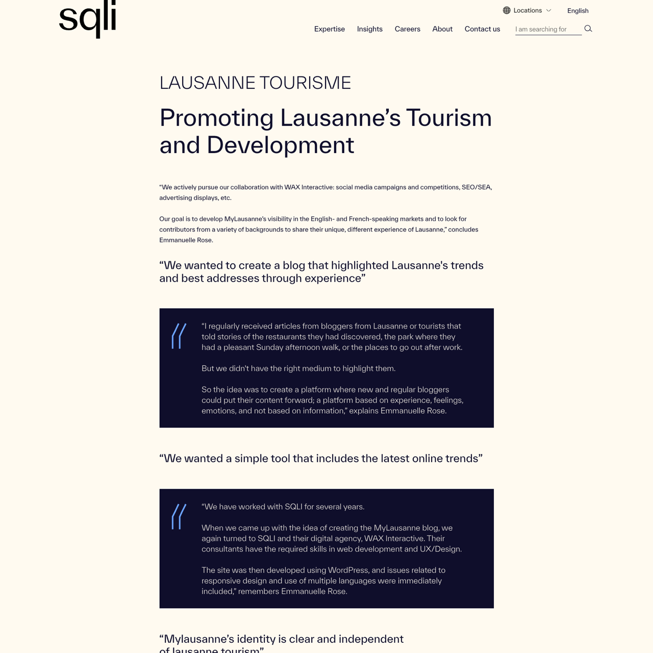 MyLausanne partnered with SQLI and WAX Interactive to create a platform that highlights local trends and experiences through a modern, emotion-driven blog. Built on WordPress, the site features responsive design and multilingual support, enabling bloggers to share authentic stories about Lausanne. The result was a vibrant community of contributors, increased visibility in English and French-speaking markets, and a strong focus on user-generated content. The design emphasized emotional engagement, transforming the blog into a hub for genuine, immersive experiences of Lausanne. The project successfully aligned the brand with a contemporary, experiential approach to digital storytelling.