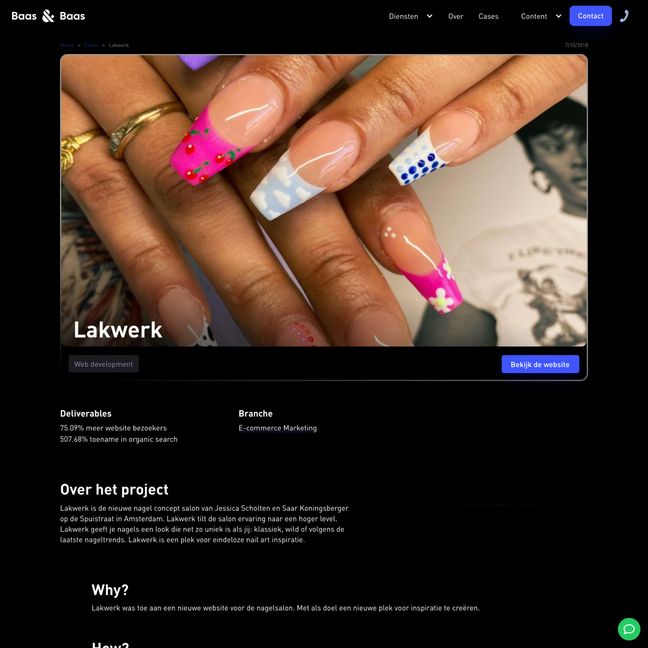 Lakwerk, a Dutch nail salon, transformed its online presence with a WordPress-based platform, achieving a 75% increase in website traffic and 507.68% organic search growth between Q1 and Q2 2018. The site's design reflected the salon's unique, creative identity, leading to a -5.36% bounce rate improvement. The project showcased Baas & Baas' expertise in SEO optimization and web development, delivering a modern, inspirational platform for nail art inspiration.