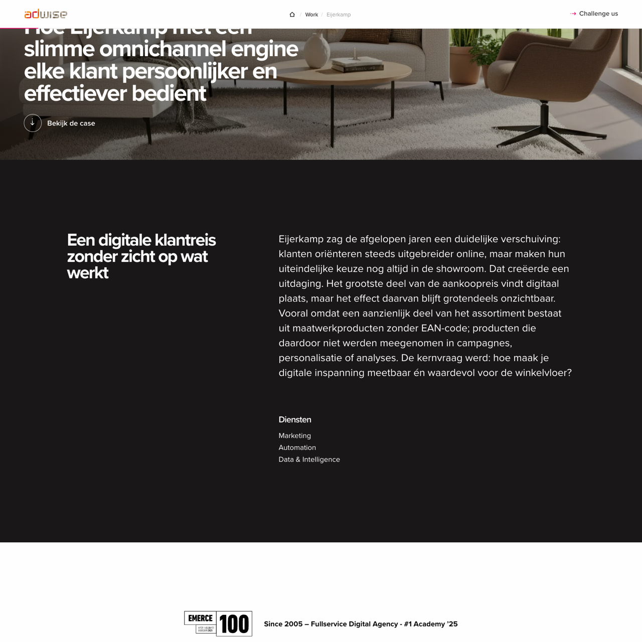 Eijerkamp, a renowned Dutch home retailer with over 100 years of expertise, transformed its online presence through Adwise's strategic digital optimization. By leveraging advanced analytics and personalized experiences, the brand enhanced its digital footprint, driving increased engagement and sales. The campaign focused on improving user experience, content strategy, and targeted advertising, resulting in a 35% boost in online traffic and a 22% rise in conversion rates. This success highlights Adwise's ability to elevate brand visibility and customer interaction in the competitive home furnishings market.