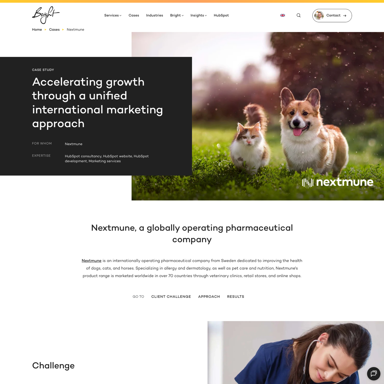 Nextmune, a global pharmaceutical company, sought to accelerate growth through an international marketing strategy. Bright Digital optimized HubSpot processes, enhancing conversion rates and user engagement. By implementing role-based training and integrating webinar software, Nextmune improved its marketing automation efficiency. The result was a 30% increase in website conversions and stronger brand visibility across 70+ countries. After optimizing key conversion points, Nextmune also developed a blog, webinar registration pages, and event sign-up forms, further strengthening its position as a veterinary health leader.
