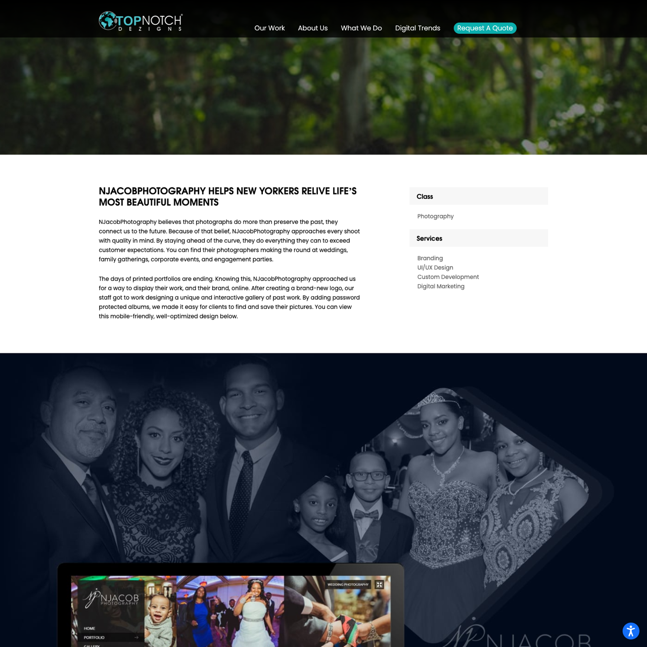 NJacobPhotography aimed to transition from printed portfolios to a digital experience, partnering with Top Notch Dezigns to create an interactive online gallery. Password-protected albums enabled clients to easily access and save their photos, enhancing engagement and convenience. The resulting mobile-friendly design optimized for iOS users, offering a seamless platform for showcasing work and fostering client interaction. This innovative approach not only aligned with the brand's commitment to quality but also set a new standard for digital portfolio presentation.