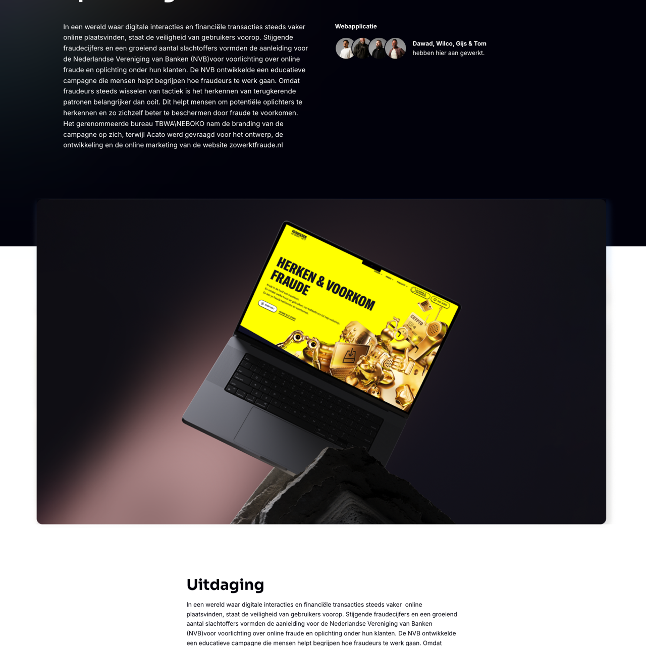 The Netherlands Bankers Association (NVB) launched a comprehensive campaign to educate users about online fraud and phishing, addressing rising crime statistics and the need for proactive protection. Acato designed a dynamic, interactive website that highlights recurring patterns in fraud tactics, empowering users to recognize and avoid threats. The platform features real-time data, case studies, and expert insights, making it a vital resource for financial security. TBWA NEBOKO branded the initiative, ensuring consistent messaging and user engagement. The campaign successfully increased awareness and provided actionable tools to combat digital threats, demonstrating Acato's expertise in creating impactful educational content.