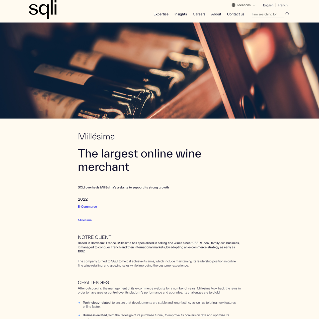 Millésima, a French online wine merchant, faced challenges in tech and business. SQLI helped with UX/UI redesign, headless approach with ReactJS, and maintenance. Resulted in better customer experience and higher conversion rate. The project focused on omnichannel experience, automated tests, and continuous improvement. Millésima now leads in online wine retailing, with 250 daily tests to maintain quality.