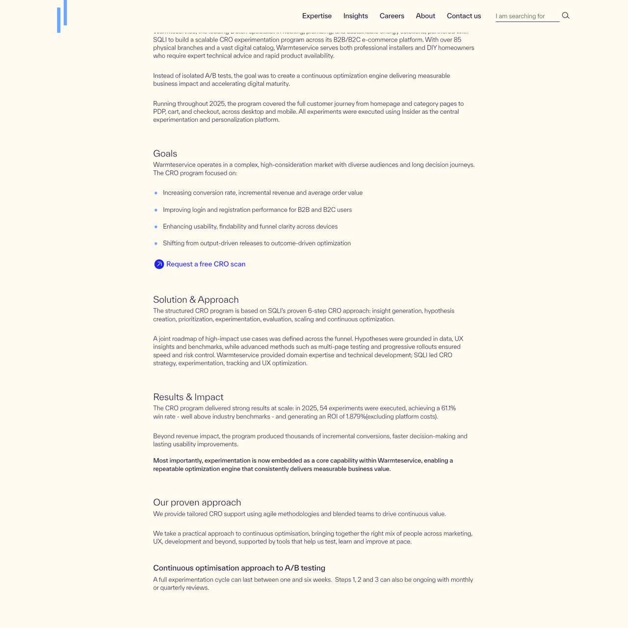 Warmteservice, a Dutch heating and energy solutions provider, implemented a comprehensive CRO program to enhance conversion rates and customer experience across its digital platform. By leveraging SQLI's advanced experimentation and personalization tools, the company optimized the full customer journey, from homepage to checkout, across desktop and mobile. The program focused on improving usability, login performance, and funnel clarity, driving measurable business impact and accelerating digital maturity. Through a structured 6-step approach, Warmteservice achieved significant improvements in conversion rates, average order value, and user engagement, demonstrating the power of data-driven optimization and continuous improvement.