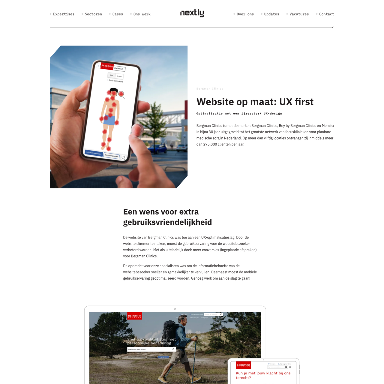 Bergman Clinics optimized its homepage navigation to improve conversion rates. By introducing a choice menu, the website enhanced user experience and increased planned appointments. The redesign focused on intuitive navigation and information delivery, aligning with user needs and improving site performance. The project involved wireframing, design, and testing to create an optimal user experience.