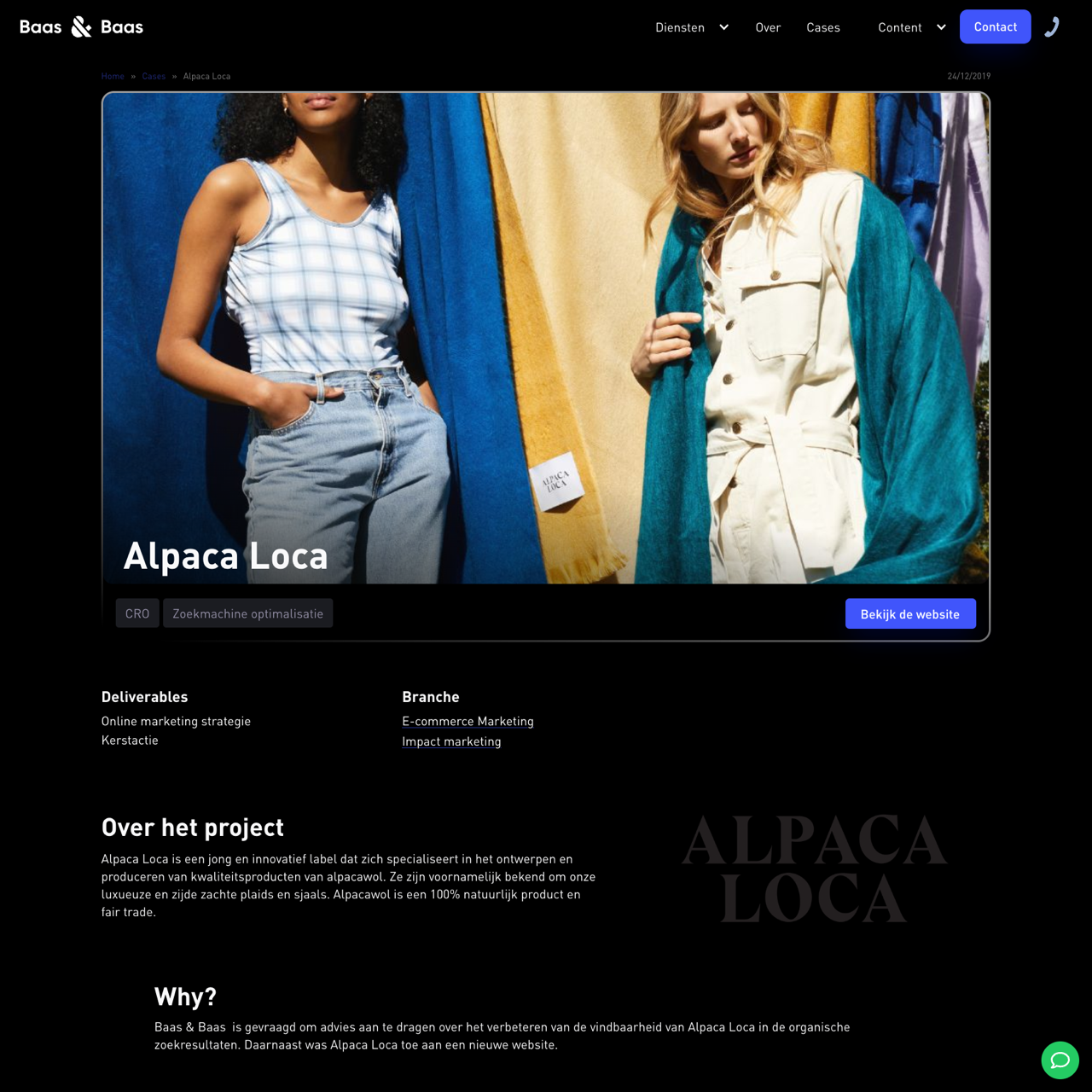 Baas & Baas optimized Alpaca Loca's SEO for better organic visibility, improving their online presence and driving more traffic. The strategy included SEO optimization, SEA campaigns, Facebook ads, and email marketing. The Christmas campaign was successfully executed, leading to higher conversion rates. The results were positive and satisfied the client. The website is now more visible in organic search results.