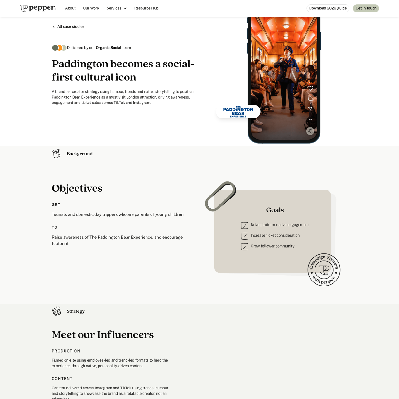 The Paddington Bear Experience transformed into a social-first cultural phenomenon by leveraging trend-led content and personality-driven storytelling across Instagram and TikTok. The campaign generated 8.1 million views, 22,000 new website visitors, and 105,000 likes, achieving a 7.8% engagement rate. By blending authentic humor, nostalgia, and reactive content, the brand sparked organic sharing and positioned itself as a must-visit destination for families and young adults. The success of the campaign solidified Paddington Bear’s status as a culturally relevant, platform-native cultural icon.