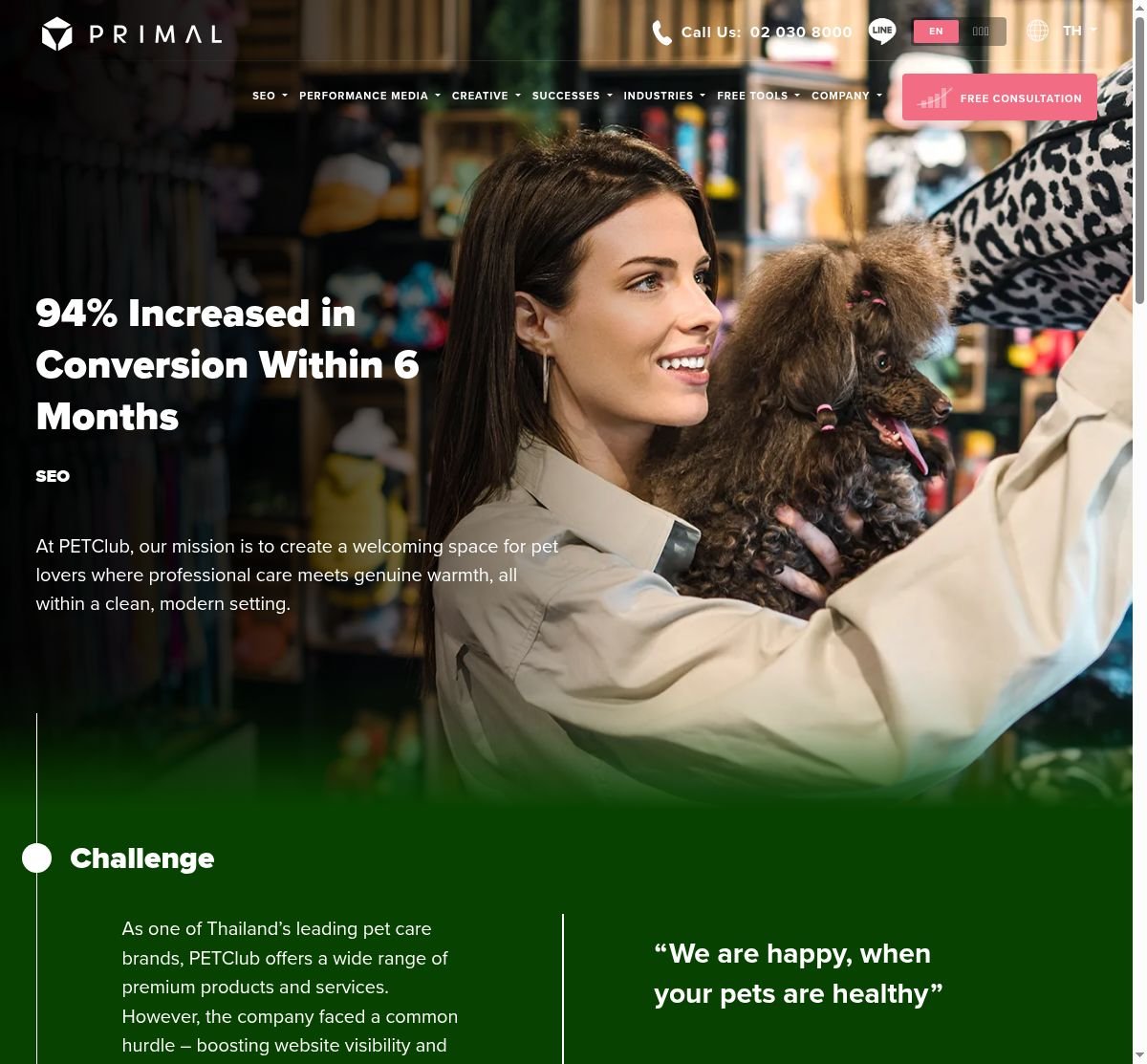 Primal, a top-tier agency, partnered with PETClub, a leading pet care brand in Thailand, to tackle a common yet significant challenge – increasing website visibility and driving meaningful conversions. Despite PETClub’s robust offerings, the key issue was ensuring potential customers could find them online and feel compelled to take action on the site. Primal’s approach was comprehensive, involving strategic keyword research, content strategy development, and technical SEO improvements. The application of the E-E-A-T (Expertise, Authoritativeness, and Trustworthiness) framework across all content planning efforts further ensured credibility and visibility.