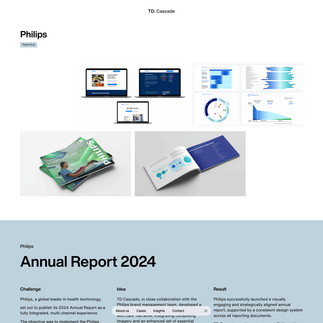 Philips aimed to create a multi-channel annual report integrated across Workiva, reflecting its focus on health innovation. TD Cascade developed an interactive PDF and responsive HTML landing page, ensuring consistent design and strategic alignment. The project emphasized future-proofing, with visual assets updated to support evolving reporting needs. The result was a visually engaging, cohesive experience across all reporting documents. The design maintained brand identity while adapting to the platform's requirements.