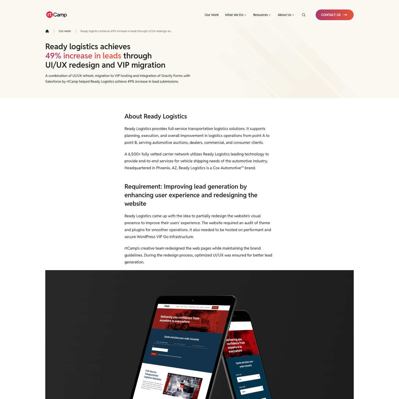Ready Logistics Boosts Leads by 49% via UI/UX Redesign & WordPress VIP Migration