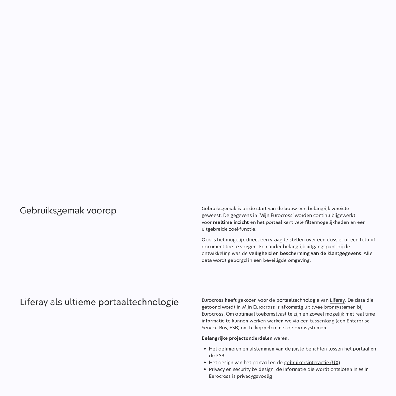 Eurocross's 'Mijn Eurocross' provides real-time insights into client support, offering dynamic access to incident details, legal obligations, and agreed-upon arrangements. Designed for internal and external clients, the portal ensures secure, privacy-compliant data management through continuous updates and advanced search capabilities. The platform prioritizes user experience with customizable filters and real-time updates, while leveraging Liferay's secure infrastructure to deliver reliable, actionable information. By integrating real-time data and robust security, Eurocross enhances transparency and efficiency in client support workflows.