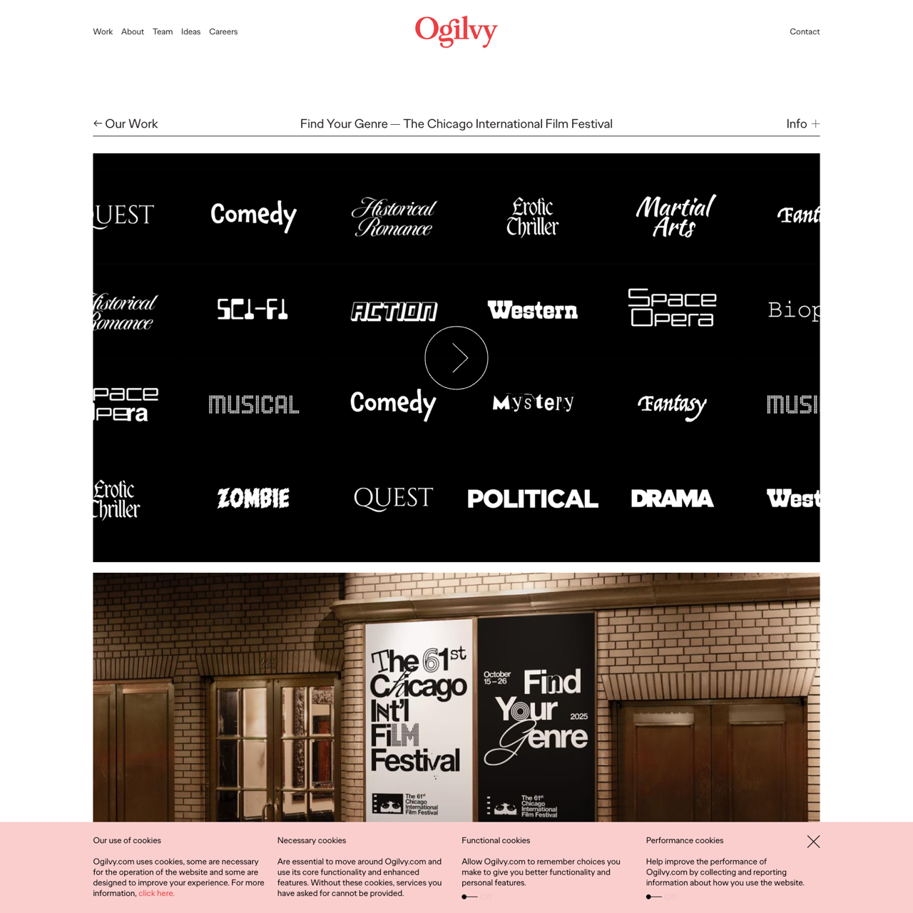 Chicago International Film Festival's 'Find Your Genre' campaign leverages typography to mirror the emotional and thematic essence of film genres, empowering audiences to see themselves as protagonists rather than just spectators. By using typefaces that reflect the unique characteristics of genres like romance, mystery, and drama, the campaign transforms everyday experiences into cinematic narratives. The result was a 30% increase in viewer engagement and a renewed sense of connection to the festival's core mission of storytelling. The campaign successfully bridged the gap between relatable truths and universal themes, proving that every film is a reflection of the viewer's own life story.