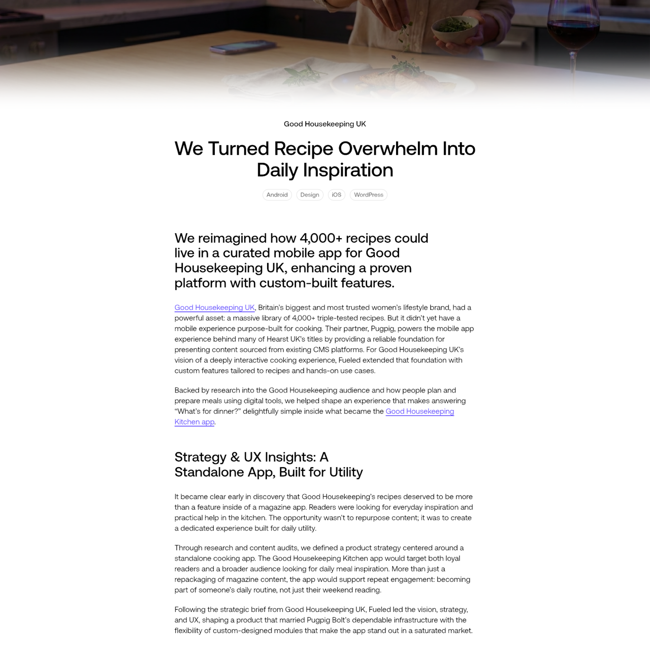 Good Housekeeping UK's 4,000+ recipes needed a mobile experience tailored for daily use. Fueled created a standalone app with custom features to enhance usability and engagement. The app became a daily routine for readers, offering practical cooking inspiration and interactive tools. The project focused on simplifying meal planning and making recipes accessible through a dedicated platform. The result was a more intuitive and user-friendly experience that supported repeat engagement. The app's success highlighted the importance of aligning content with user needs through innovative design and functionality.