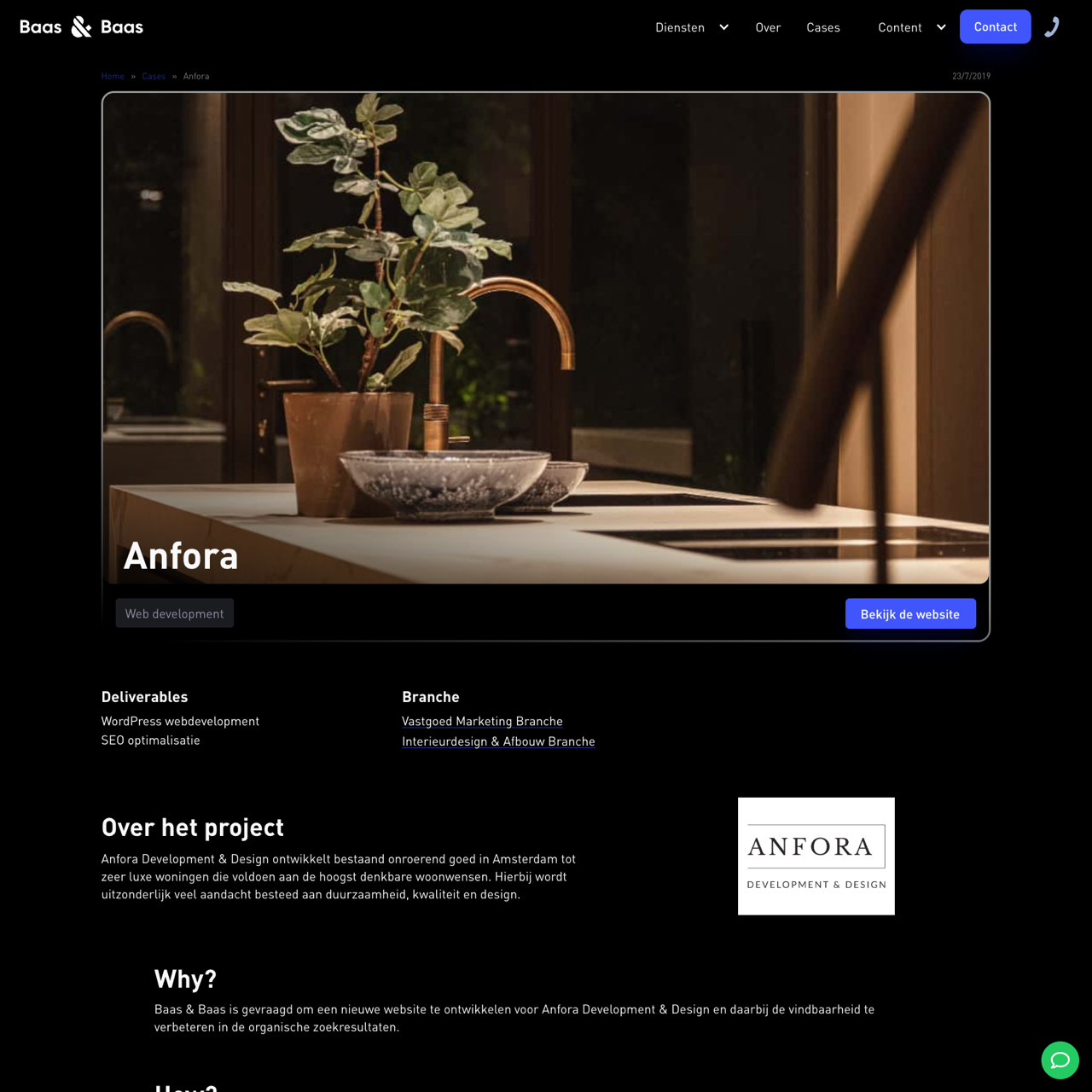 Baas & Baas developed a responsive website for Anfora Development & Design, enhancing organic search visibility. The new site highlights project portfolios with stunning visuals, driving traffic and engagement. Through optimized on-page SEO, Anfora improved its Google rankings, offering a modern, professional look that reflects its commitment to quality and sustainability. The project successfully increased visibility and user interaction, demonstrating the power of effective web development and SEO strategies.