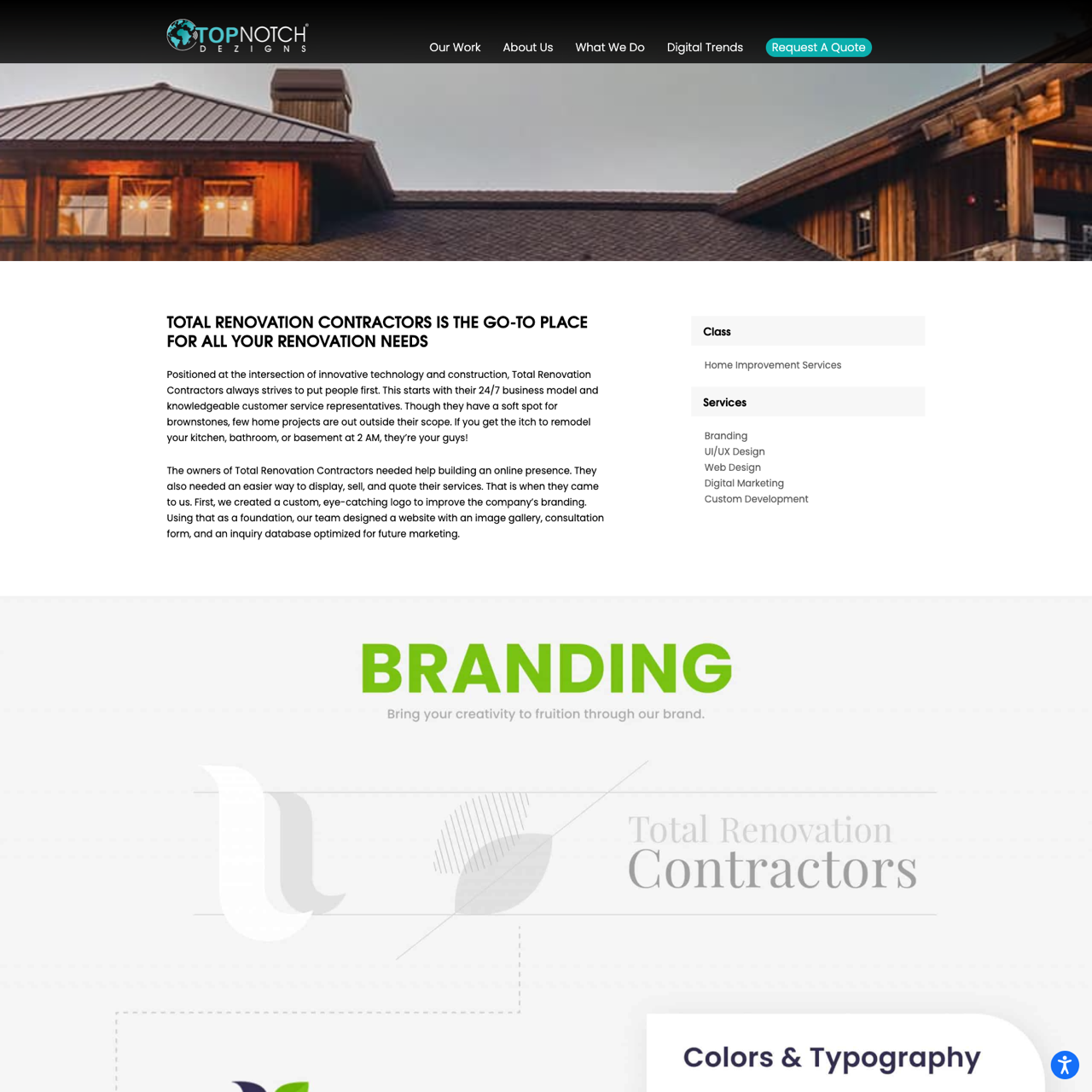 Total Renovation Contractors needed to elevate their online presence and streamline service delivery. Top Notch Dezigns crafted a custom logo and developed a website featuring an image gallery, consultation form, and an inquiry database optimized for marketing. The redesign enhanced brand visibility and simplified customer engagement, enabling the company to reach a broader audience. The platform's intuitive design and integrated tools improved service efficiency, allowing Total Renovation Contractors to offer faster, more accurate quotes and better customer support. The project resulted in a stronger digital footprint and increased online visibility for the brand.