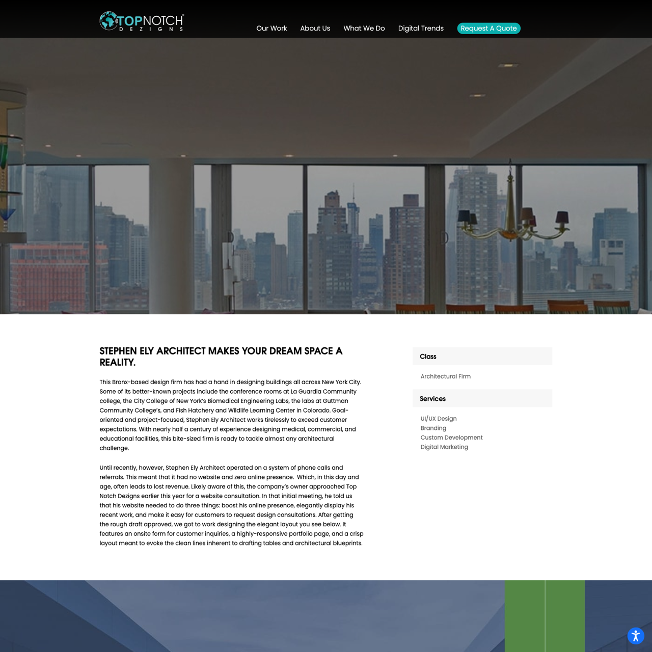 Stephen Ely Architect, a Bronx-based design firm with a legacy of crafting medical, commercial, and educational spaces, faced a critical challenge: a lack of online presence that hindered revenue growth. After a year of strategic planning, Top Notch Dezigns redesigned their website to elevate visibility, showcase recent projects, and streamline customer engagement. The resulting platform features an onsite inquiry form, a responsive portfolio, and a clean, architecturally inspired design that mirrors the firm's aesthetic. The revamped site has successfully boosted online visibility and streamlined access to design consultations, aligning with the client's goal of enhancing their digital footprint. The project exemplifies Top Notch Dezigns' ability to transform underperforming digital assets into compelling, user-centric platforms.