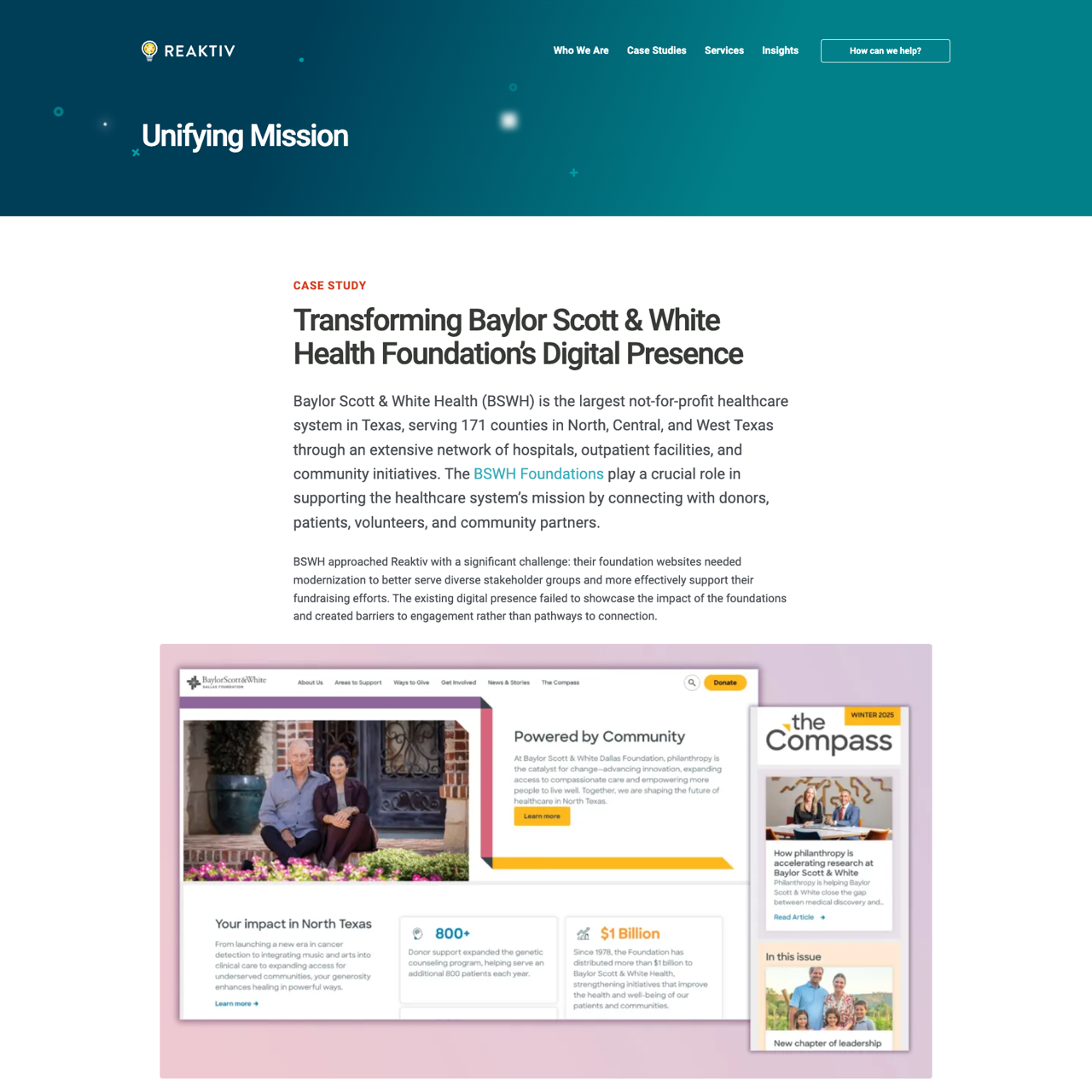 Reaktiv transformed BSWH Foundations' digital presence by creating a cohesive, adaptable ecosystem that enhanced storytelling and donor engagement. The project addressed fragmented user experiences across multiple sites, ensuring consistent navigation and content organization. By integrating powerful patient stories and community impact narratives, the redesign made it easier for donors to connect with the foundation's mission and take meaningful action.