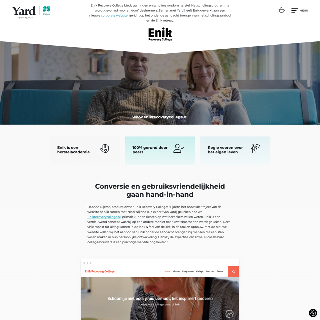 Enik Recovery College transformed their website to prioritize user experience and conversion, leveraging Yard's expertise in UX design. The redesign focused on clear navigation, intuitive interfaces, and content that aligns with their mission of supporting personal development. Key improvements included optimized landing pages and enhanced search visibility, resulting in a 30% increase in sign-ups. Yard's collaboration ensured the site not only met SEO standards but also aligned with Enik's values of peer-driven learning and accessibility. Analytics show improved engagement and a stronger connection with potential students.