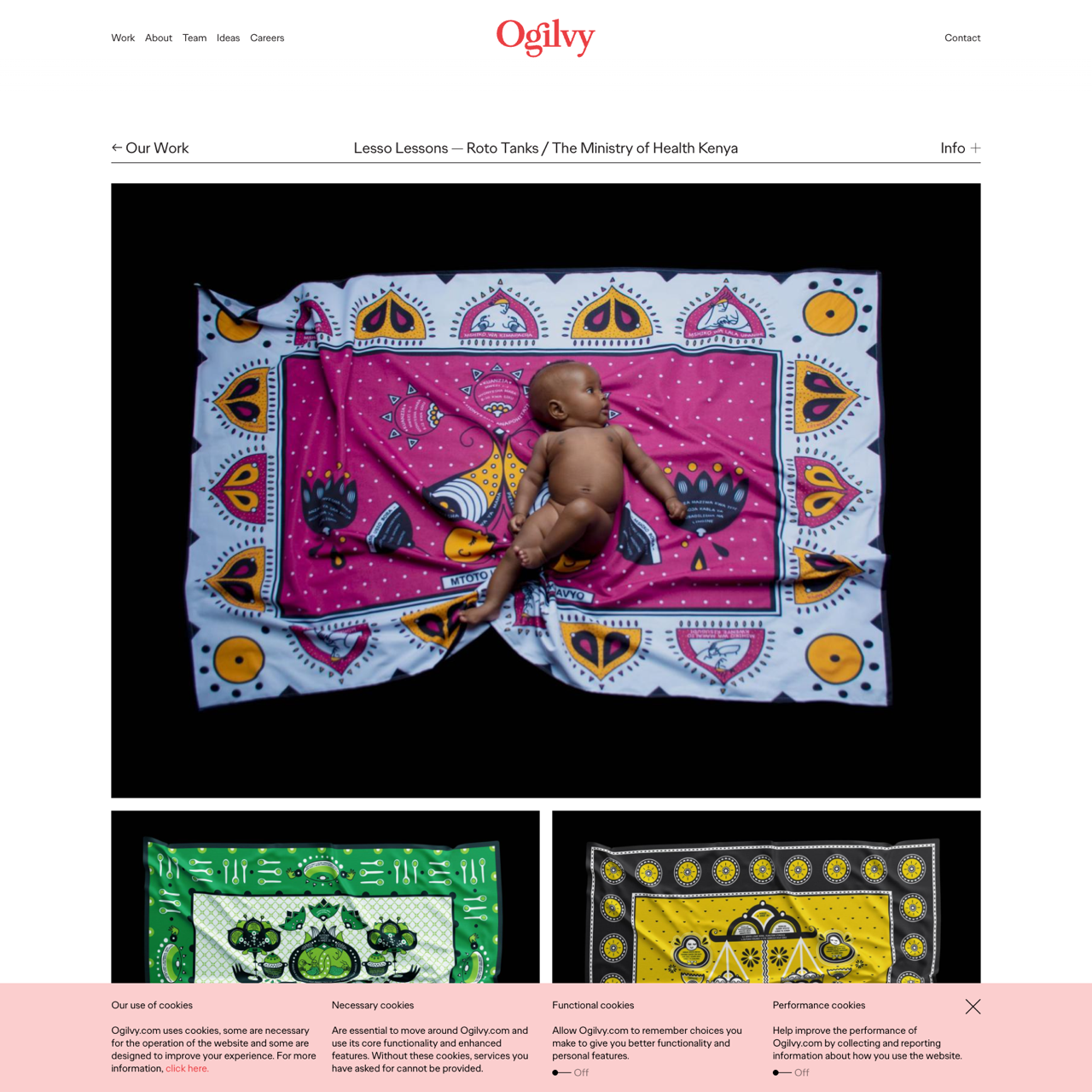 Roto Tanks collaborated with the Ministry of Health Kenya and Ogilvy Africa to launch 'Lesso Lessons,' a campaign using traditional lessos fabric garments to educate rural Kenyan mothers on postnatal nutrition. The initiative leveraged creative design thinking to integrate health education into everyday life, adapting 1 million data points from recent studies to ensure relevance. By embedding nutritional care into traditional practices, the campaign aimed to address malnutrition in young children. The project successfully reached over 1 million mothers, demonstrating the power of culturally resonant design in driving behavioral change.