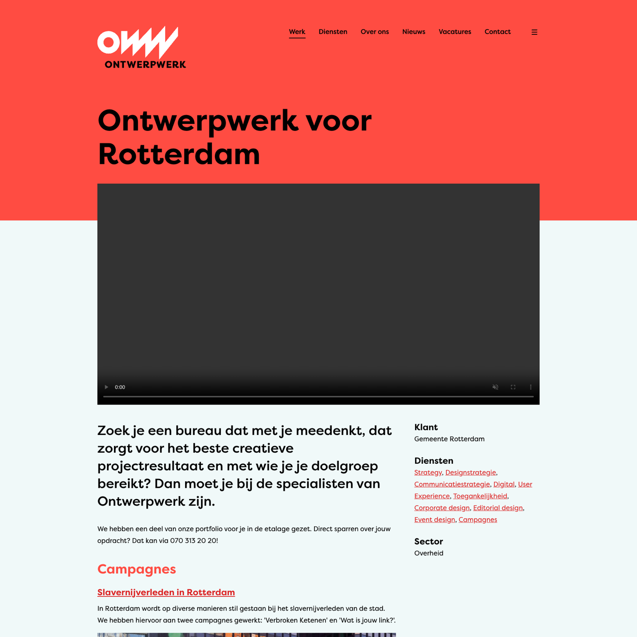 Ontwerpwerk designed impactful campaigns in Rotterdam to address historical injustices and behavioral changes. The 'Slavernijverleden in Rotterdam' campaign used tram stops, cityboards, and posters to raise awareness about slavery's legacy. The 'Gedragscampagne voederverbod' combined flyers and milkpaint designs to promote healthy habits and reduce animal-related disturbances. These initiatives successfully engaged the community and fostered a more inclusive environment. For the internal 'SO Werkt 't' campaign, Ontwerpwerk created reflective tools that transformed the workspace into a space for personal reflection and leadership development.