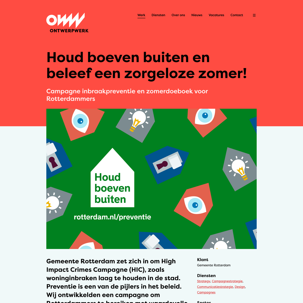 The city of Rotterdam partnered with Ontwerpwerk to create a summer safety booklet aimed at raising awareness about burglary prevention. The booklet, filled with colorful illustrations, practical tips, and engaging puzzles, was designed to educate both residents and children on how to stay safe during the summer. By focusing on simple, actionable advice, the campaign successfully encouraged proactive measures to reduce burglary incidents. The booklet also included a certificate for 'master burglars,' making it both informative and fun. The strategic approach emphasized accessibility and engagement, ensuring the message reached a wide audience. The campaign's success highlighted the importance of creative, community-focused initiatives in combating crime.