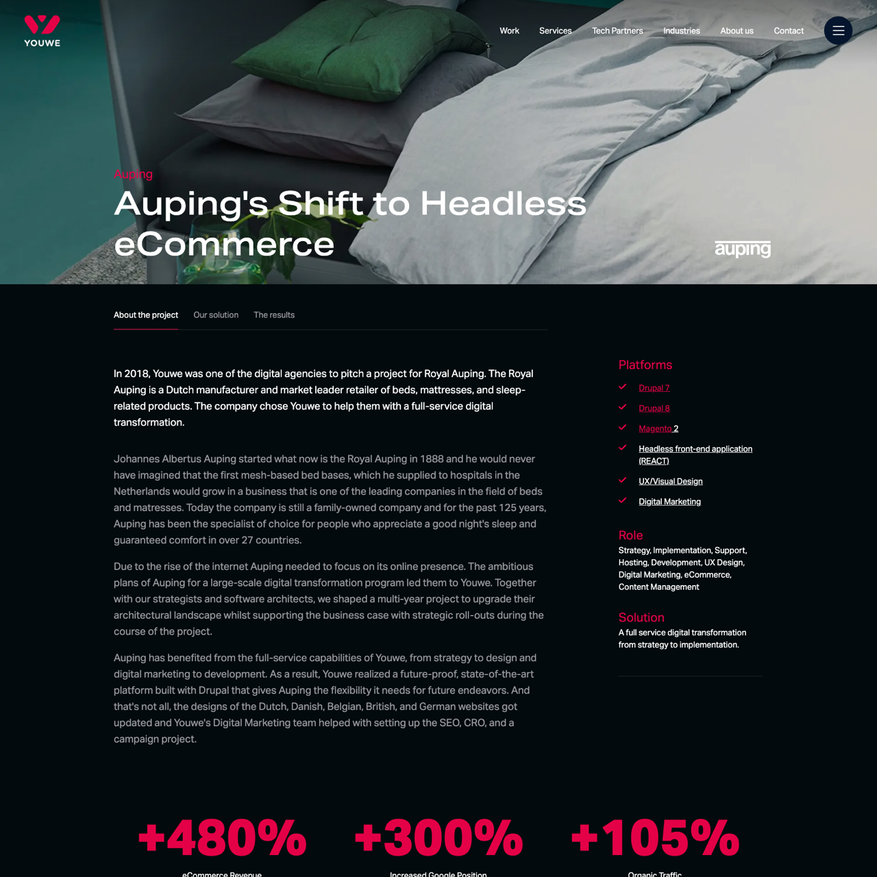 Royal Auping, a Dutch leader in beds and mattresses, partnered with Youwe to revamp its digital presence. The project focused on upgrading their architectural landscape and expanding eCommerce capabilities, resulting in a 480% revenue increase and a 105% rise in Google Position. Youwe provided strategic design, digital marketing, and development services, creating a future-proof Drupal platform that supported global expansion. The initiative also included SEO, CRO, and campaign optimization, with websites updated to reflect regional preferences. The transformation not only boosted online visibility but also solidified Royal Auping's position as a market leader in sleep-related products.