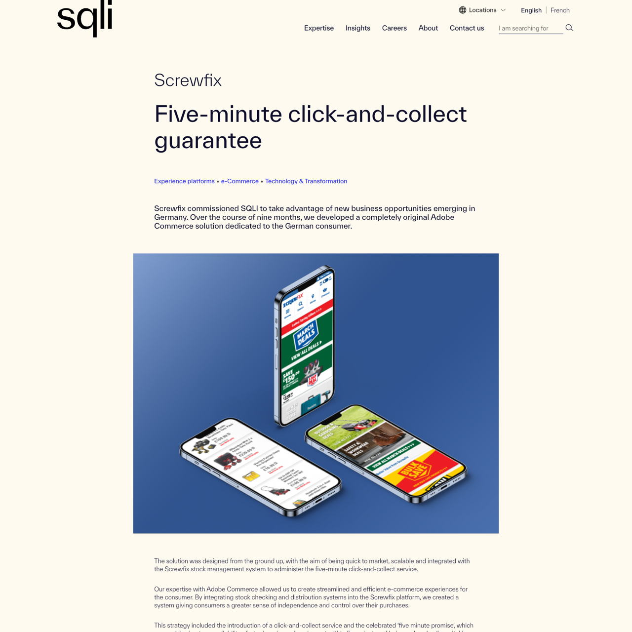Screwfix commissioned SQLI to innovate their German market strategy, developing an Adobe Commerce solution for the five-minute click-and-collect service. The platform enabled rapid deployment, seamless integration with stock management, and a streamlined consumer experience. This initiative drove significant expansion in Germany, with the five-minute promise attracting tradespeople and enhancing customer satisfaction. The success of this project laid the foundation for nationwide store openings in Ireland and beyond. The building-block nature of Adobe Commerce allowed efficient scaling, ensuring the new site's digital strategy aligned with Screwfix's pureplay approach in the region.