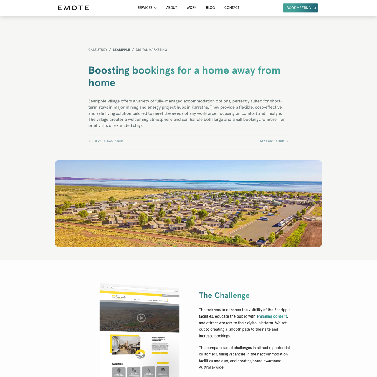Searipple Village faced challenges in attracting visitors and filling vacancies in their accommodation facilities. Emote Digital implemented a comprehensive digital marketing strategy, including organic social content, social ads, and search engine advertising, to enhance visibility and drive bookings. By leveraging audience insights and optimizing creative content, the campaign effectively increased engagement across multiple platforms. The result was a significant boost in bookings and improved brand awareness in the mining and energy sectors. The campaign successfully transformed Searipple Village into a more prominent destination for workers in major mining and energy hubs in Karratha.