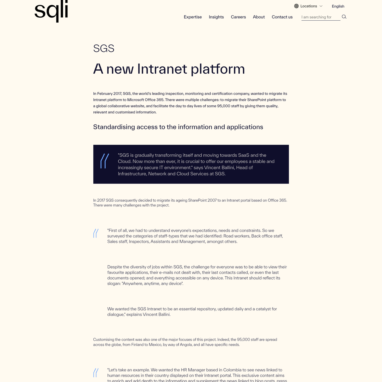 SGS migrated its SharePoint 2007 to Office 365 to create a unified, secure platform for 95,000 employees globally. The project focused on standardizing access and customizing content to meet diverse regional needs. By leveraging Office 365, SGS ensured employees could access their favorite apps, emails, and documents from any device, aligning with its 'Anywhere, anytime, any device' slogan. The migration also emphasized daily updates and fostering collaboration. Key outcomes included improved accessibility and tailored content for regions like Colombia, where HR news was localized. The result was a more efficient, employee-centric IT environment.