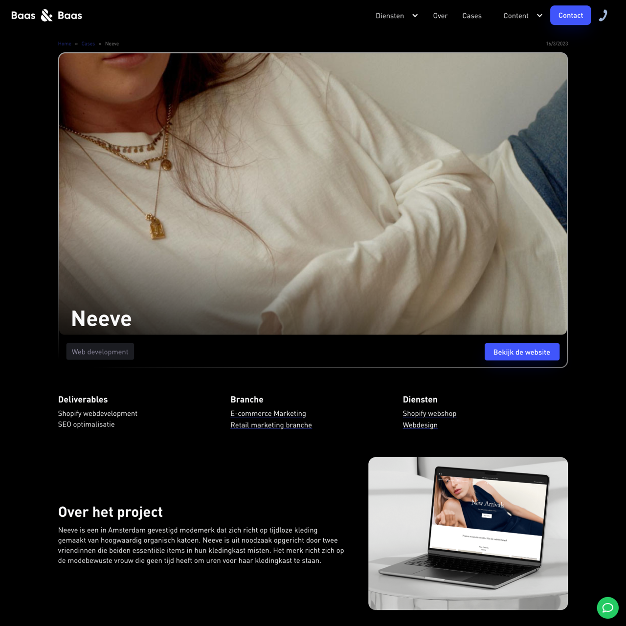 Neeve, a Dutch brand specializing in organic cotton clothing, partnered with Baas & Baas to build a modern, SEO-optimized website. The project focused on creating a user-friendly platform that enhanced visibility and growth. Through thoughtful design and strategic SEO, the website became a key driver of the brand's success, reflecting the brand's commitment to sustainability and fashion-forward aesthetics. The collaboration resulted in a visually appealing, functional platform that now supports Neeve's continued growth and presence in the fashion industry.