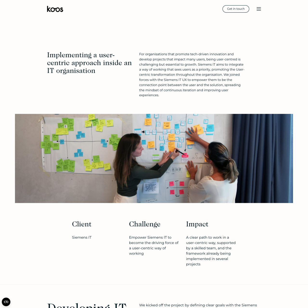 Siemens IT transformed its approach to work by creating a user-centric framework through a UX Maturity Assessment and practical guide. The project involved educating stakeholders and developing a toolset to reframe IT operations toward user-focused solutions. By integrating strategic advice and a pilot program, the organization achieved a more skilled team and a clear roadmap for sustainable user-centric practices. The initiative highlighted Siemens IT's commitment to aligning its operations with user needs, fostering innovation and efficiency in its IT solutions.