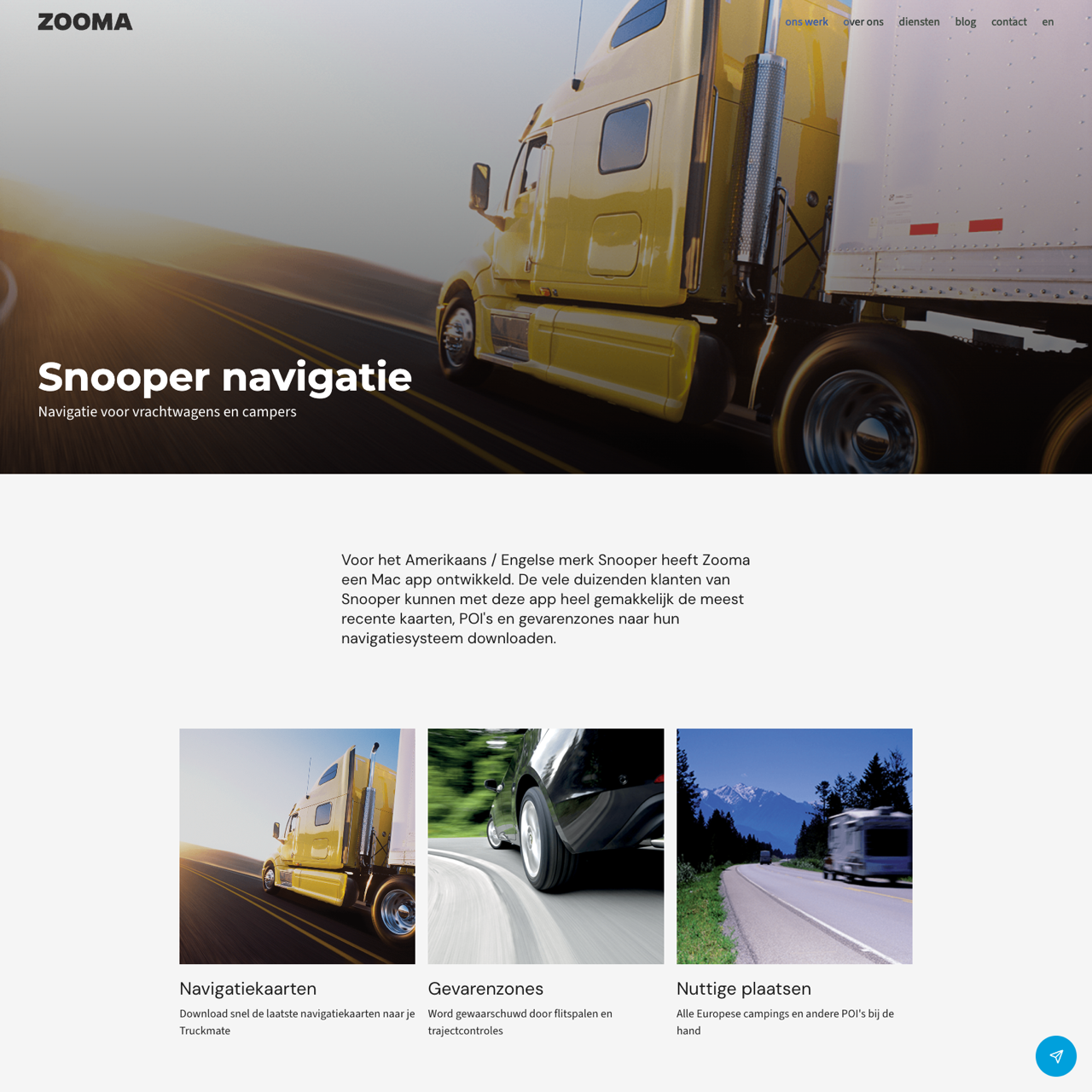 Snooper's Mac app enables users to download the latest maps, POIs, and hazard zones directly to their Truckmate navigation system. Zooma developed the app to simplify the process, allowing drivers to access real-time data effortlessly. The solution leverages advanced mapping technology to ensure accurate route planning, even in complex terrain. The app was built with wireframes, resulting in a user-friendly interface that enhances navigation for truck and camper drivers across Europe. The partnership between Zooma and Snooper has significantly improved the efficiency and reliability of navigation for thousands of drivers in the region.