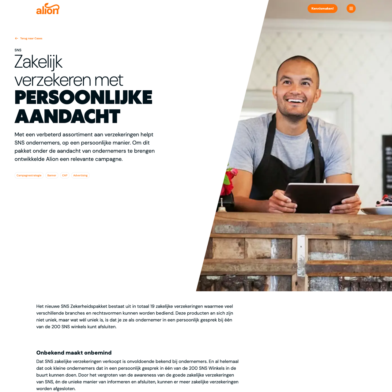 SNS's new business insurance package aims to boost awareness among small businesses by offering personalized service through 200 stores. The campaign positions SNS as the go-to provider for tailored business insurance solutions, leveraging the unique advantage of direct, in-store consultations. By targeting the 'moment of truth'—when businesses consider their first business insurance—SNS highlights its commitment to personalized attention. The strategy focuses on educating entrepreneurs about the benefits of bespoke insurance, emphasizing convenience and expert guidance. The campaign successfully increased awareness and engagement, driving more business insurance contracts through the SNS network.