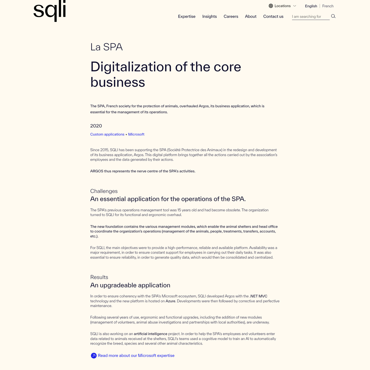 The SPA modernized its core business application, Argos, through a comprehensive digital transformation. SQLI redesigned the platform using .NET MVC and hosted it on Azure, ensuring high performance and reliability for seamless operations. The new system integrates all critical functions, from animal management to financial records, enabling efficient coordination across the organization. The platform supports ongoing upgrades, including new modules for volunteers and local authorities, while also exploring AI-driven enhancements. This transformation significantly improved operational efficiency and data consistency across the SPA's animal shelters and head office. The platform's robust architecture and scalability meet the demands of a growing, mission-critical application.