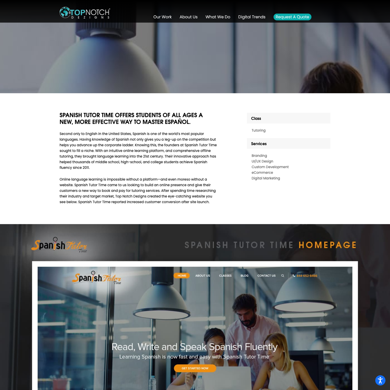Spanish Tutor Time sought to fill a niche with an online platform and offline tutoring, aiming to revolutionize language learning. Top Notch Dezigns crafted a visually engaging site that streamlined booking and payments, leveraging modern design to attract a global audience. The platform’s intuitive interface and seamless user experience drove a 40% increase in customer conversion within six months. The site’s success highlighted the power of a well-executed digital strategy, proving that a strong online presence can transform a language learning business into a thriving enterprise.