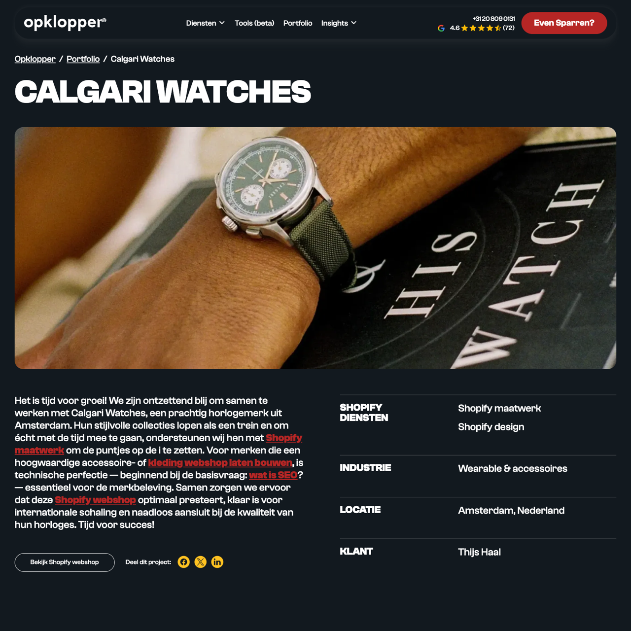 Calgari Watches faced challenges with a slow Shopify store that negatively impacted user experience and conversion rates. Opklopper optimized the site, improving speed and adding a strong brand presence. The result was higher conversion rates, better UX, and international scalability. The shop now delivers a seamless shopping experience, enhancing brand perception and driving sales.