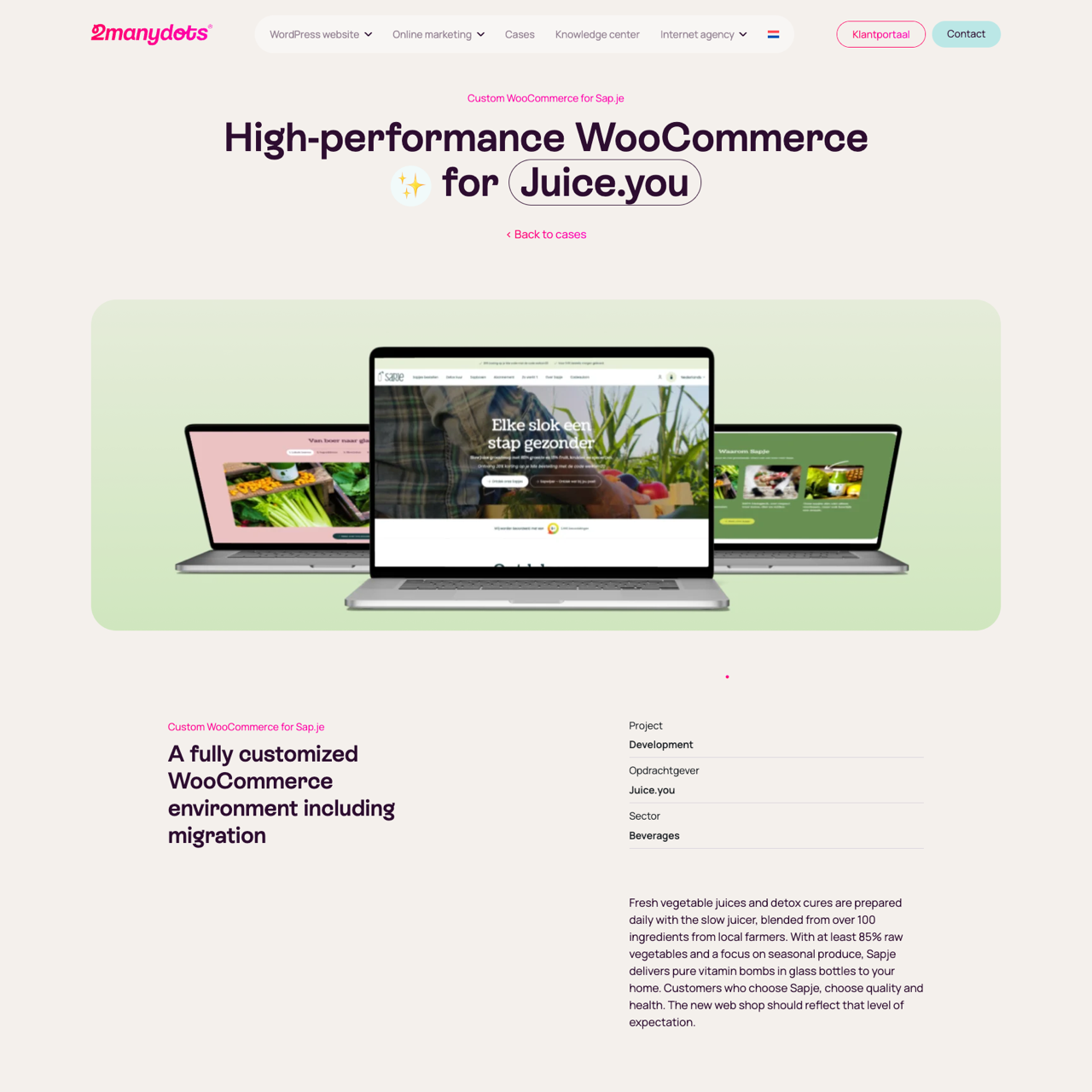 Sapje's new web shop was built using a fully customized WooCommerce environment to ensure speed and stability. The shop runs on a dedicated server with Redis caching, allowing pages to load at lightning speed even with complex filters. The migration of over 190,000 orders and subscriptions was handled seamlessly, maintaining the store's performance and customer experience. The solution included a custom export functionality that sends orders directly to LeenMenken, ensuring a perfect connection between the front and back end.