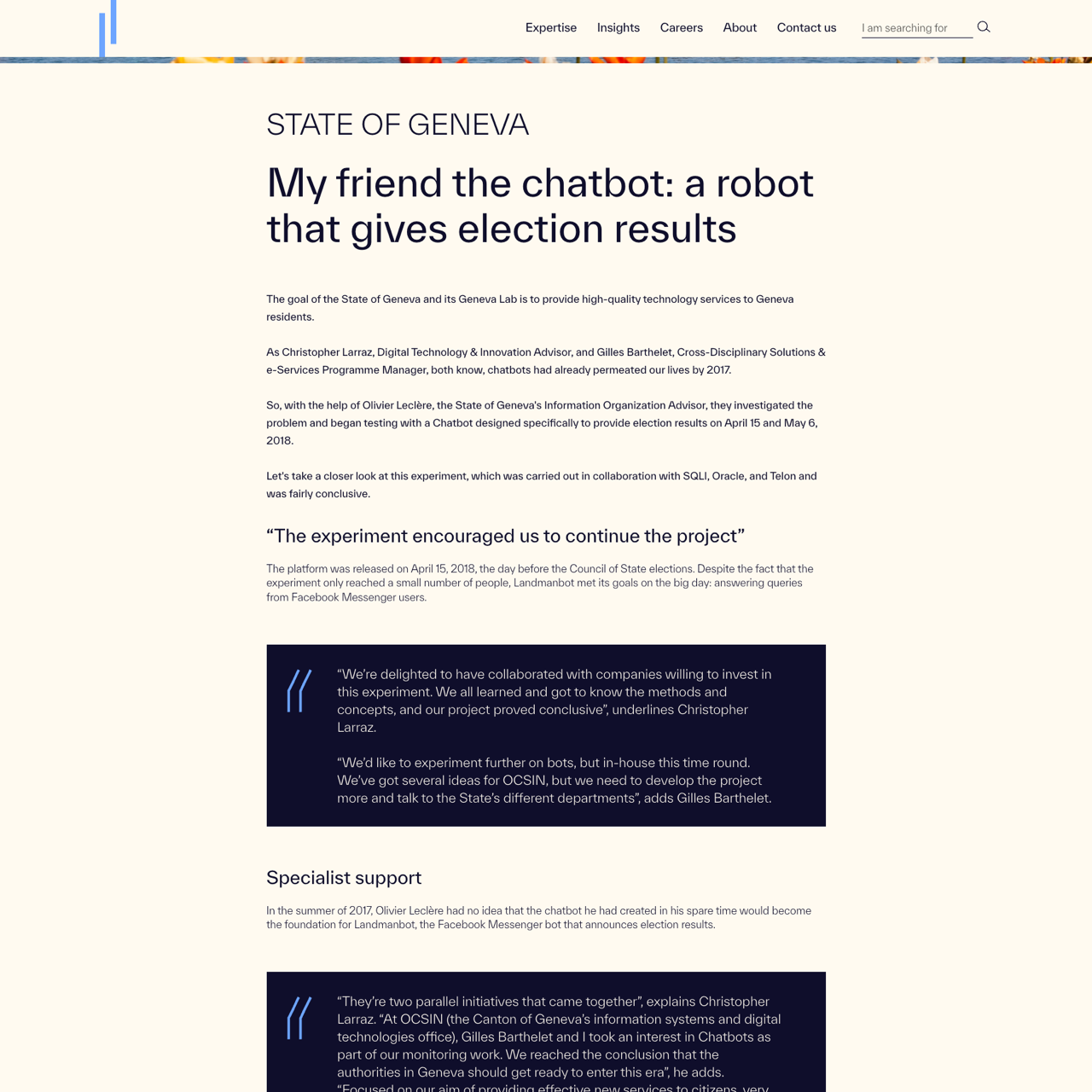 The State of Geneva partnered with Oracle and Telon to develop a Facebook Messenger chatbot that provided election results. Launched on April 15, 2018, the bot met its goals by answering queries from Facebook users. The project demonstrated the potential of chatbots in civic engagement, with Christopher Larraz and Gilles Barthelet highlighting the success of the initiative. The experiment also led to further exploration of bot technology within the Canton of Geneva. In the summer of 2017, Olivier Leclère, the Information Organization Advisor, created a chatbot that later became the foundation for Landmanbot, a Facebook Messenger bot announcing election results. The collaboration with SQLI, Oracle, and Telon showcased the power of technology in enhancing public services and civic participation.