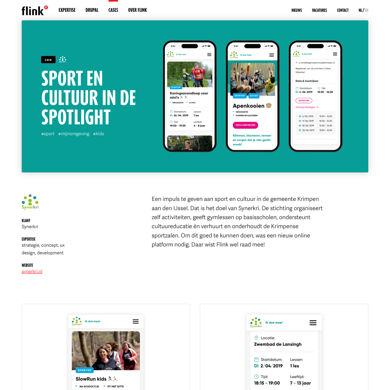 Flink helped Synerkri develop a Drupal 8 platform to support sports and culture in Krimpen aan den IJssel. Through strategic sessions, they positioned the brand, considered diverse user groups, and created an SEO-friendly platform for membership, enrollment, and activity access. The platform enables schools and individuals to engage in sports and cultural events seamlessly. Flink's expertise ensured the platform aligns with Synerkri's goals, offering a professional, user-friendly solution. The result is a well-structured, accessible platform that supports the organization's mission. The design and functionality are tailored to meet the needs of the community, making it a sustainable and effective tool for future growth.