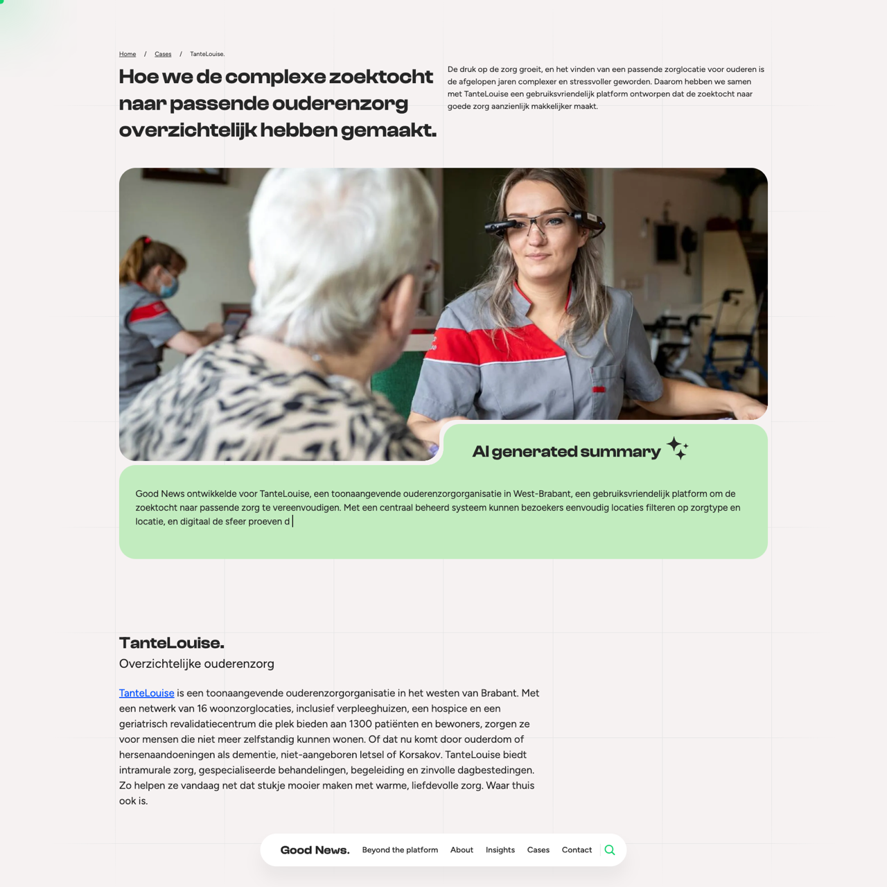 TanteLouise faced challenges in helping seniors find suitable care, requiring a streamlined approach to simplify the search process. By developing a centralized CMS and digital guides, they created a user-friendly platform that enhances accessibility and efficiency. The solution enables easy management of multiple sites, reducing administrative burdens and improving the experience for both patients and caregivers. This innovative approach ensures that seniors can quickly and easily find the right care, fostering a sense of comfort and belonging in their new environment.