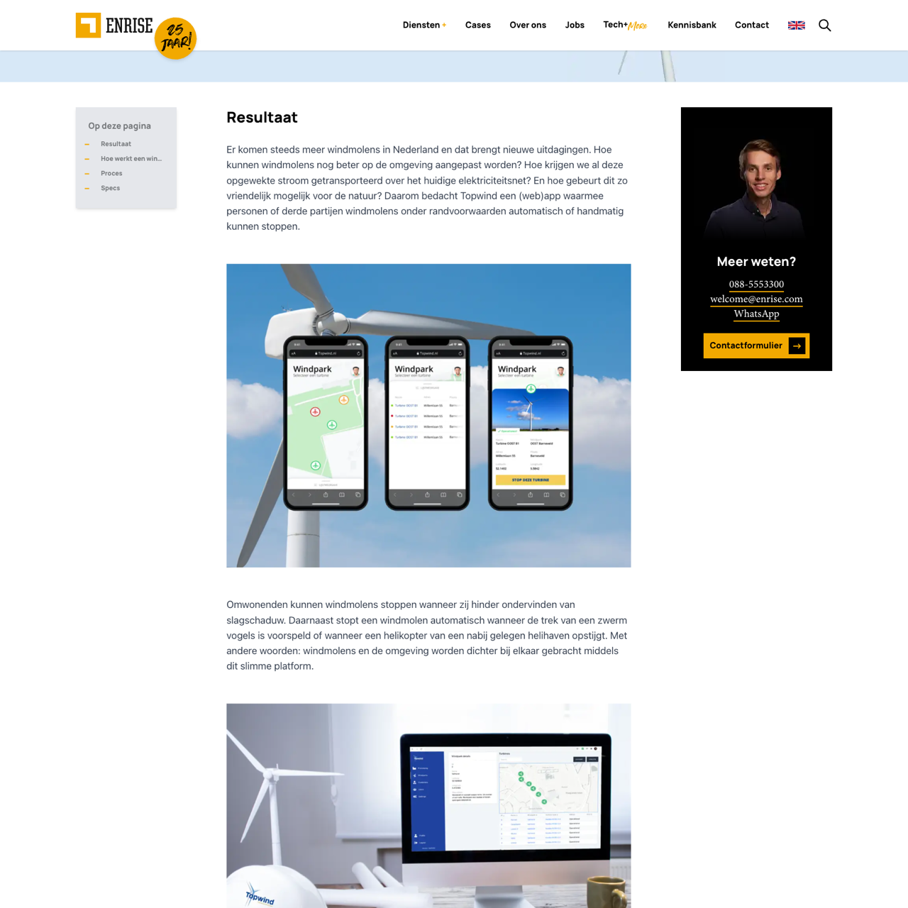 With increasing windmills in the Netherlands, challenges arise in adapting them to environmental conditions. Topwind's RCS platform allows windmills to automatically or manually stop under specific conditions, such as shadow obstruction or bird activity prediction. The platform ensures windmills remain operational while minimizing environmental impact. Enrise developed the platform, enabling real-time adjustments to windpark operations. The solution integrates smart technology to optimize windpark safety and efficiency, demonstrating scalability for future expansion. The platform successfully deployed in early wind parks, showcasing its potential to address energy transition challenges.