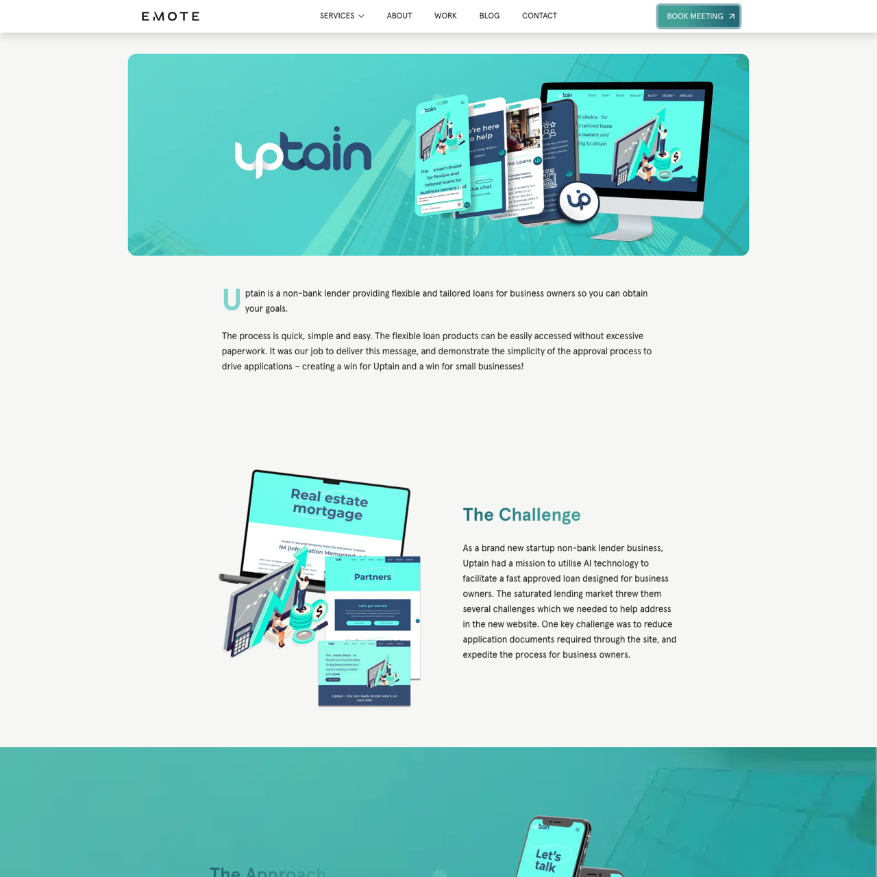 Uptain's new website aimed to streamline the loan application process by reducing paperwork and accelerating approvals. Emote Digital's UX team designed a responsive layout focusing on key messages like cheaper rates, fast approval times, and fewer documents. The result was a more user-friendly platform that boosted application rates and highlighted AI-driven loan recommendations. The vibrant design and intuitive interface helped Uptain stand out in a competitive market, driving higher engagement and conversions.
